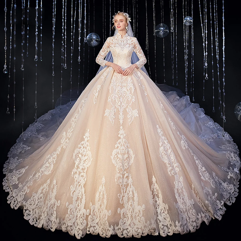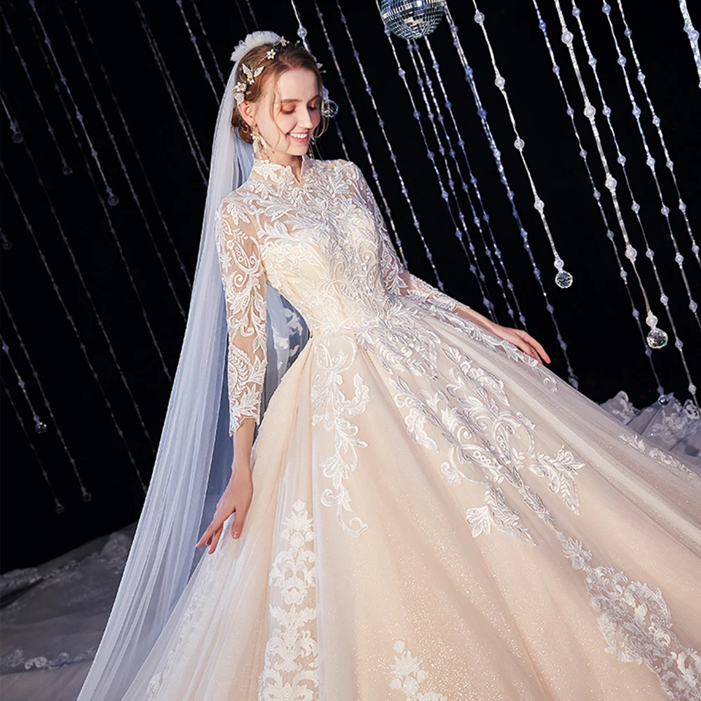 | 2021 New Arrivals High Neck Three Quarter Sleeve All Over Appliques Lace Super Gorgeous Shiny Ball Gown Wedding Dresses |